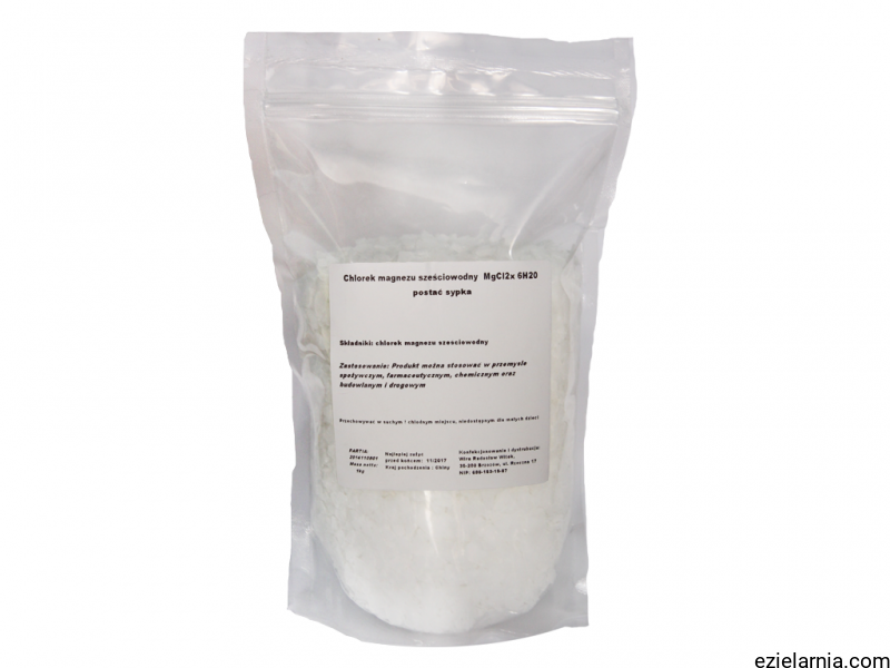 Stopień czystości: min. 99% Wzór chemiczny: MgCl2*6H2O Gatunek: spożywczy proszek pakowany zgodnie z wymaganiami i w atmosferze ochronnej. Masa netto: 1kg Opakowanie: szczelna saszetka z tworzywa Składowanie i postępowanie: Przechowywać w suchym i chłodnym miejscu, niedostępnym dla małych dzieci; produkt silnie higroskopijny; rozpływa się przy względnej wilgotności powietrza powyżej 30%.